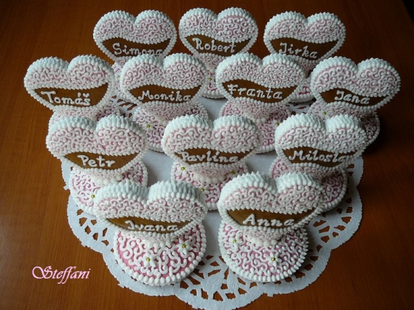 Perníkové svatební jmenovky.
